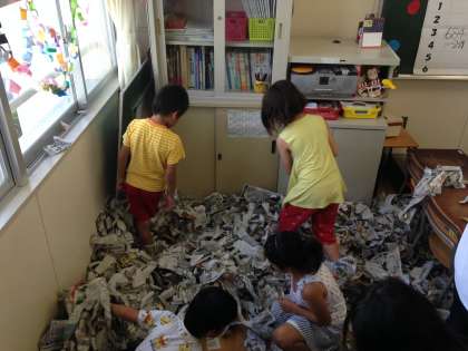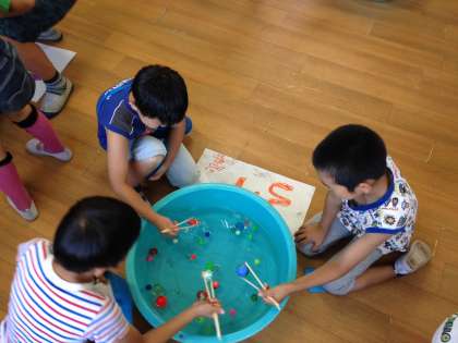 スーパーボールをおはしでつまんだり、新聞紙の山の中から牛乳キャップを探したりと、工夫された店でした。みんな楽しんでいました。
