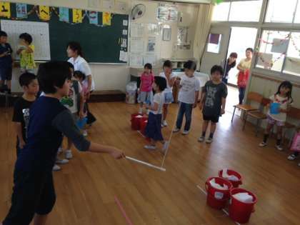 釣り竿に付けたボールを、ねらいをさだめてバケツに入れます。1人5回チャンスがありました。お店紹介は楽しい劇でした。