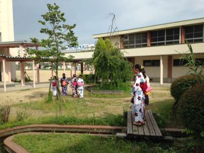 放課後、多目的室で着付けを教えていただいた子どもたちは、池の前で記念撮影をしました。