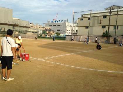 上の写真は運動場のライン引きの様子です。田川小学校はセパレートコースなので、長さをしっかりと測りながら、みんなで協力して引いています。