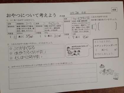 昼食から夜までの栄養を補う大切なおやつですが、そのとり方については考えなくてはならないということに、この学習で気づくことができたと思います。