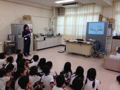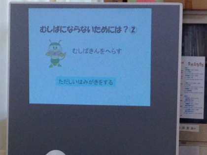 1年生の発育測定がありました。この日の保健指導は、むし歯にならないための、歯のみがき方についてでした。