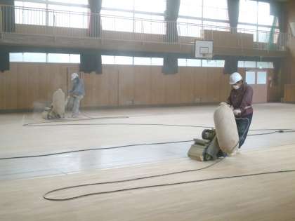講堂床工事が1月9日(木)から始まりました。床面を削って、塗装します。雨の日は体育もできなくて、児童が体を持て余しています。