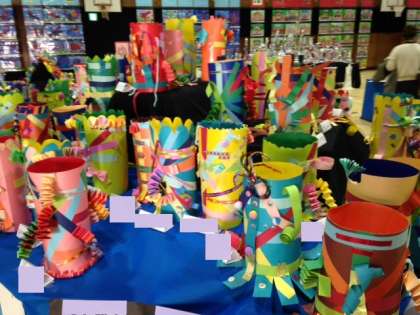 1年生の作品、図画「ひまわりと虫たち」は、筆で描いた大きなひまわりに、虫たちが遊びにきた様子を表現しました。工作「おしゃれなぼうし」は、いろいろな飾りを工夫して、自分がかぶってみたいぼうしを作りました。