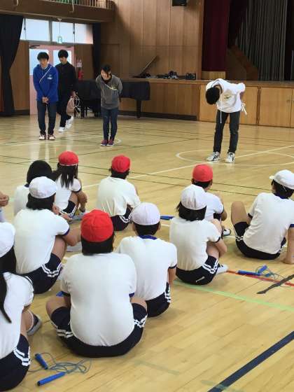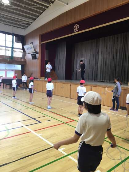 はじめに、メンバーの方のパフォーマンスを見学し、その後は1時間、二重跳びやはやぶさの練習を続けました。熱心に跳び続ける子どもたちの姿は、ふだんの体育で見せる表情とはまた違った真剣さが見られました。