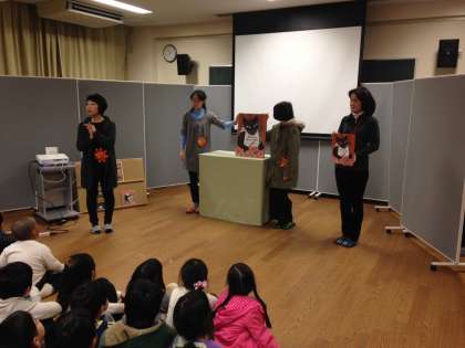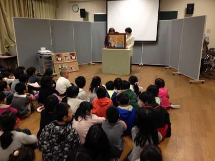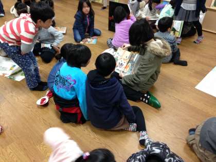 紙芝居や大型絵本の読み語りの後は、きれいに飾ってくださったたくさんの絵本をそれぞれで読んだり、読んでもらったりしていました。