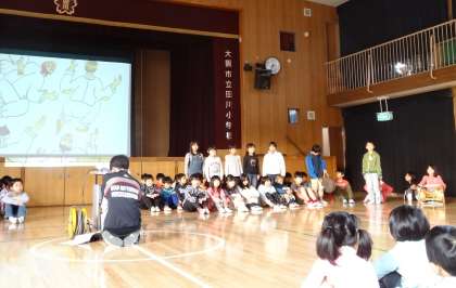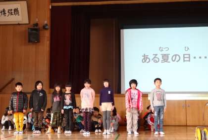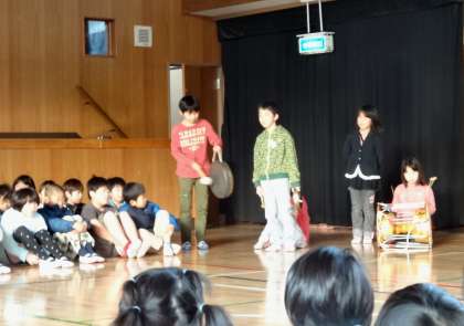3年生は、「木かげにごろり」という韓国・朝鮮の民話の音読発表をしました。民族楽器もうまく使っていました。
