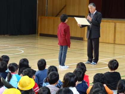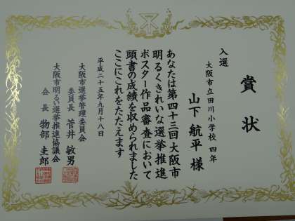 また、「大阪市明るくきれいな選挙推進ポスター」コンクールに入選した4年男子児童が表彰されました。