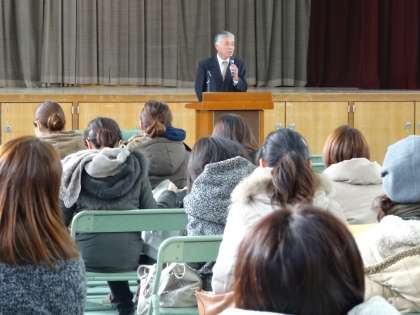田川小学校の教育方針や学校生活・持ち物・手続き等についてお話しました。60名の新入生が4月7日に入学します。