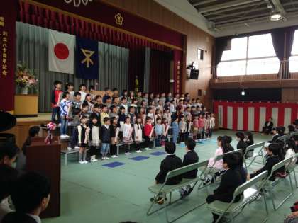 小学校の教室に入り、緊張していた新1年生でしたが、講堂へ行くころには落ち着いたのか、元気に入場していました。式の間も、がんばって話を聞き、あいさつの「礼」も、しっかりとできていました。