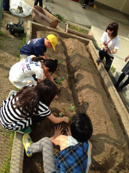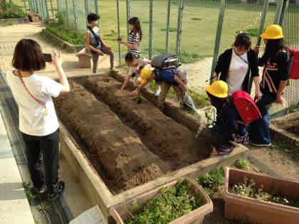 飼育栽培委員会では、畑を耕し、なすびの苗などを植えました。