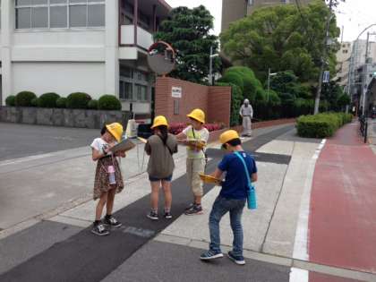 この日までに、社会科の学習で、地図の見方や方角について学習していました。この日は、学習したことを活かしながら、自分たちの住む町を地図にするために、一生懸命メモをとっていました。