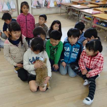 先週の1組に引き続き、今日は1年2組に、うさぎの「マロン」が出張しました。教頭先生からもうさぎのだき方等を教えてもらいました。