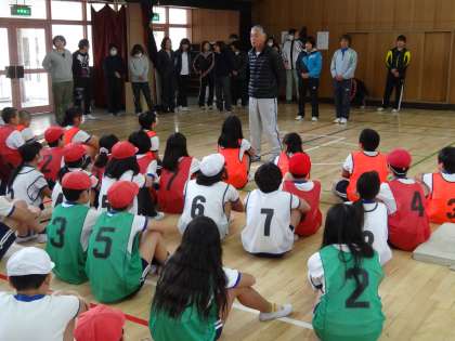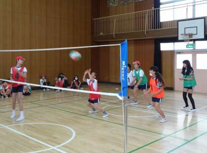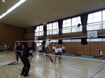 卒業生から招待状をもらい、卒業生対教職員でソフトバレーボールの試合をして楽しく交流しました。「大人げない」と児童に言われるぐらい教職員もがんばりました。