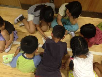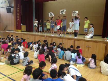 集会委員会の子どもたちが、2・3グループに分かれて、1文字ずつ大きな声で言い、その言葉を当てるゲームでした。