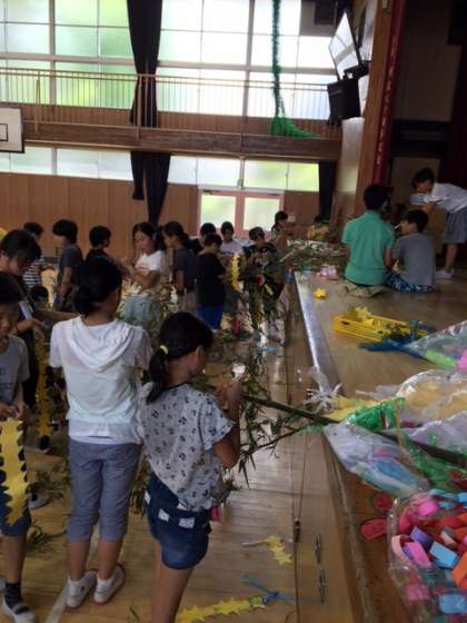 それぞれの学年が、学年に合った飾り付けを作り、6年生が講堂で一つひとつていねいに笹につけていました。