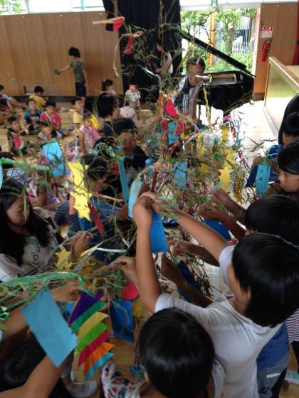 最後に、みんなで短冊をつけ、「七夕さま」を1〜4年生が歌い、5・6年生がリコーダー演奏しました。