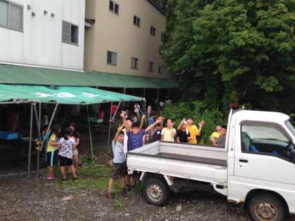 みんなが風呂に入っている間に、雨も止み、スイカを外で食べました。