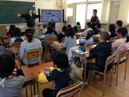 今日の6年生の授業は、新北野中学校と神津・塚本・田川小学校で英語を教えてくださるジェフリーさん。5年生の授業は、地域ボランティアの河合さん。