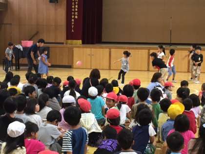 朝会で表彰された子どもたちも含め、キャッチボールを披露したり、リフティングをしたり、バレーボールのトスを見せたりと、いろいろありました。