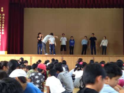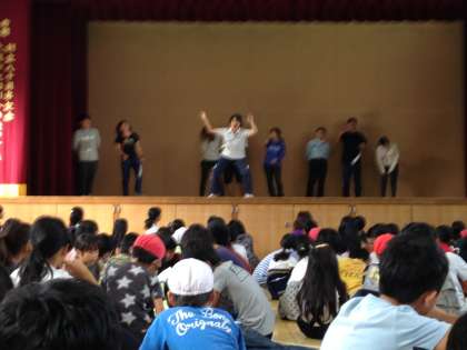 先生たちが、さまざまな動物になって、ジェスチャーで表現し、たてわり班で当てるクイズでした。