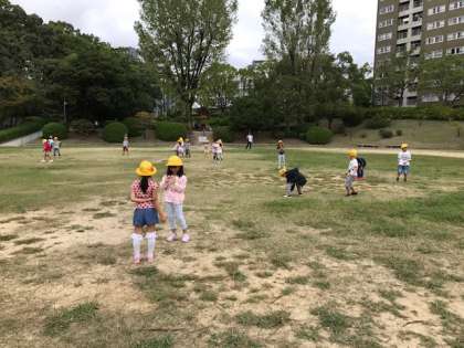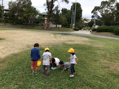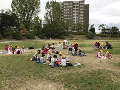 芝生で「おにごっこ」や「だるまさんが転んだ」、「虫とり」などをして遊んだ後、みんなでお弁当をたべました。