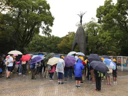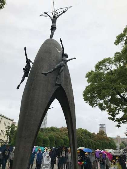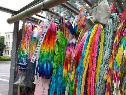 原爆の子の像の前で、平和を誓い、小学校の子どもたちみんなで作り上げた千羽鶴を、ささげました。