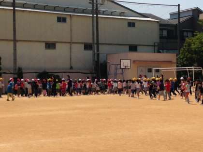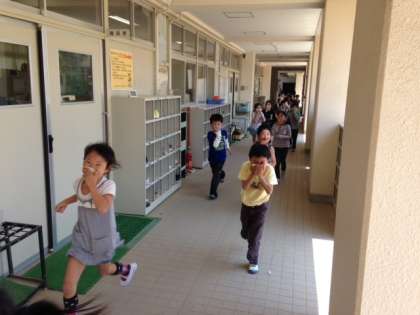 この日は給食室から火災が発生したという設定で、避難訓練をしました。