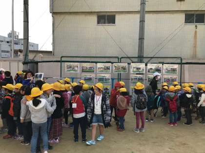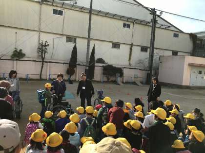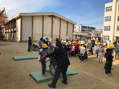 地域防災訓練では、開会式の後、子どもたちは教室で防災についての話を聞き、その後、運動場で4つのブロックに分かれ、さまざまな体験をしました。