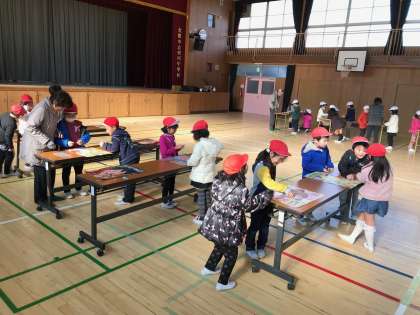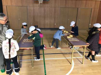 「けん玉」「お手玉」「ふくわらい」「将棋」をしているところです。