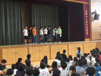 水曜日は児童集会があります。1年生から6年生までが36班にわかれ、6年生がリーダーとなって活動します。(たてわり班活動)25日は1年生が初めて参加するため、6年生のリーダーが1年生を迎えにいくことから始まりました。班で集まったあと、運営委員会の司会による「自己紹介ゲーム」をしました。「○○が好きな◇◇です」と言った後、「○○が好きな◇◇さんの隣の△△が好きな□□です」と続きます。最後の人は10人くらいの好きなものと全員の名前を言います。最後はさすが6年生!しっかり全員分の好きなものと名前を記憶して言うことができました。