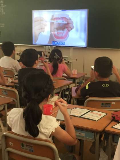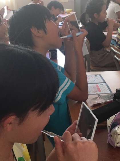 歯と口の健康について校医先生からお話をしていただきました。また、DVDを観ながら具体的に自分の歯茎をチェックしたり、歯垢を落とすための正しい歯の磨き方を練習したりしました。普段、何げなく磨いているだけでは歯垢が残っているかもしれず、そのことによって歯茎にまで影響を及ぼすことを学習しました。今日から、しっかり意識して磨き残しのないように歯磨きできることでしょう。