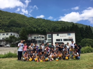 お世話になる宿舎サンダイフクに無事に到着しました。早速、開舎式をすませ、お弁当を食べた後は、みんなで記念撮影をしました。
