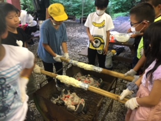 アルミホイルを竹にまきつけ、生地をつけます。かまどでくるくる回しながら焼いていきます。
