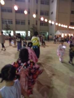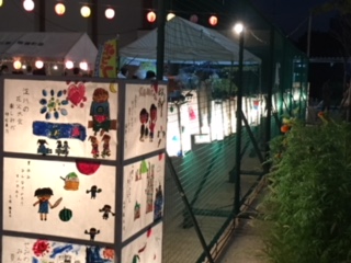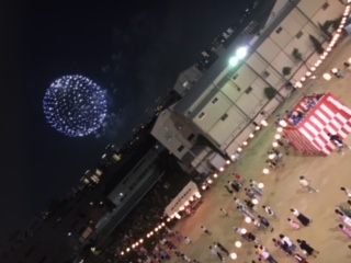 日も暮れ、灯篭にも灯りがともりました。踊りも始まり盛り上がってきたところに、淀川の花火が打ち上げられ、さらに盛り上がっています。
