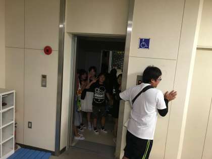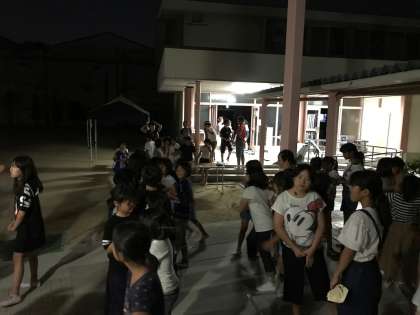 夕食の後、怖い話がいいという子どもたちは講堂へ、怖い話は嫌だという子どもたちは多目的室に分かれました。