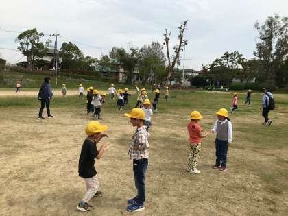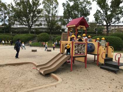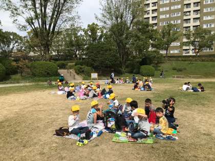 清々しい青空の下、1年生が遠足に行きました。行き先は、千里南公園です。はじめに、公園で松ぼっくりやどんぐり拾いをし、大きな広場へ向かいました。広場では、たこ星人をさがせゲームや、おにごっこをして、体を動かしました。その後、虫とりなどをし、みんなでお弁当を食べました。お昼の後は、公園の遊具でも遊びました。1日、自然の中で、ゆったりと過ごすことができました。楽しい遠足になりました。