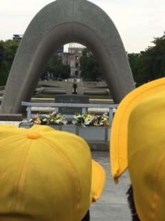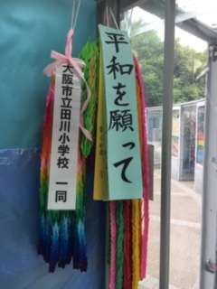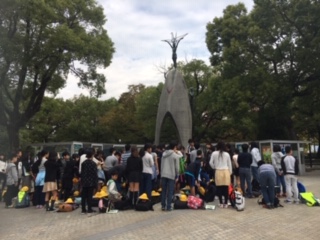 原爆の子の像の前で慰霊祭をしました。田川小学校のみんなで折った鶴も捧げてきました。