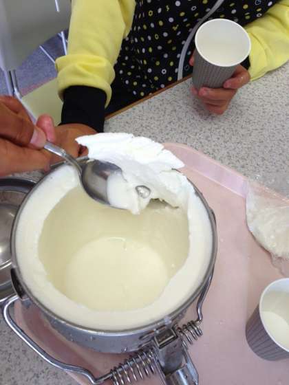 専用容器にアイスクリームの材料を入れ、氷と塩を周りに敷きつめ、ころころ転がすと・・・・・ハイ!アイスクリームの出来上がり!^0^/