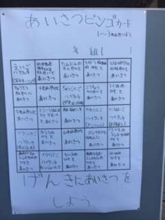 今日からあいさつ週間がはじまり、校舎内に元気のよい朝のあいさつが響いています。前回、子どもたちに好評であった「あいさつビンゴ」がさらにパワーアップしました。ちがう学年の人や外国の言葉でのあいさつなど、子どもたちは楽しみながら取り組んでいます。これを機に朝のあいさつをもっと積極的にできるようになってほしいです。