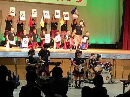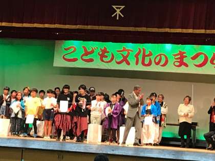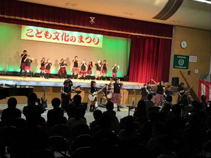 こども文化のまつりが、区民センターで行われました。淀川区内の子どもたちの作品を子ども会ごとに展示したり、「子ども会親善各地区対抗子ども芸能大会」が開催されたりしました。芸能大会では、田川連合子ども会の音楽クラブが、軽音楽&ダンスを披露しました。出場子ども会の最後に登場し、「あいうえおんがく・じょいふる・GOOD LUCKY!!!!・淀川音頭—TAGAWAオリジナルロックバージョン」を演奏しました。かっこよく演奏するだけでなく、全員が元気よくダンスをしていたので、最優秀の賞をいただくことができました。