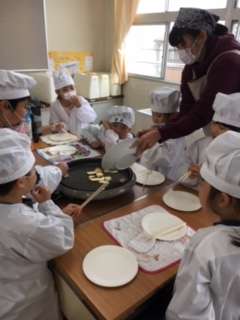 1年生が自分たちで育てた「いも」を焼いて食べることにしました。先生にホットプレートの上にイモを置いてもらい、自分たちでイモをひっくり返しながら焼きます。47人もいるので、小さく切ったイモを2〜3個くらいしか食べることができませんでしたが「おいしい」と満足気に言って食べていました。