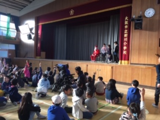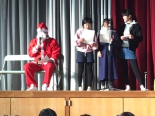 今日の集会は「クリスマスに関するクイズ」でした。特別ゲストとして、サンタクロースが答えを教えにきてくれました。低中高学年用のクイズがあり、だんだん難しくなっていきます。サンタクロースの解説をきくことで、クリスマスについて詳しく知ることができました。最後のクイズが終わると、忙しいサンタクロースはおもちゃ作りにもどっていきました。