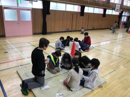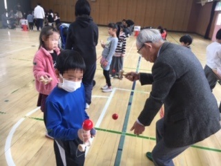 「けんだま」「お手玉」を教えていただきました。こまは、すこし難しかったようですが、地域のの方にていねいに教えていただき、まわすことができるようになっていました。