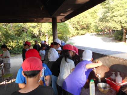 しっかり食べた後は、後片付け。使った鍋や食器を使う前のようにきれいにするのは至難の業。でも一回で合格をもらえるように、みんなでがんばって磨きました。そのがんばりのおかげで、ほとんどの班が一回目のチェックで合格でした。