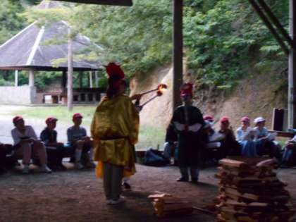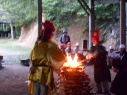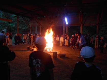1日目の夜の締めくくりは、キャンプファイヤー。日が暮れてきたころ、火の神様から火をもらいうけました。広場の真ん中に組まれた大きな薪に火が灯されると、大きな炎となり、子どもたちからは歓声が上がりました。火の粉が夜空に舞う中、キャンプファイヤ—の担当を中心に歌やゲームで盛り上がりました。楽しい時間はあっという間に過ぎていきました。