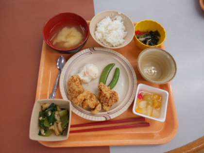 食事係が配膳の準備をし、昼食は食堂でいただきました。挨拶のときに食事係からクイズが出され、楽しい雰囲気で食事が始まりました。ごはんやお味噌汁をお代わりする子もいて、みんなしっかり食べていました。