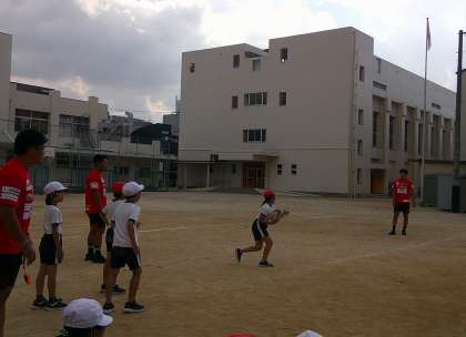 プロの選手に来ていただき、パスやキャッチの仕方について、楽しく教えていただきました。プロの選手のパスやキックなど迫力ある技もたくさん見せていただき、子どもたちはそのたびに「すごい!」と目を輝かせて感動していました。暑い中でしたが、45分間しっかり体を動かし楽しく活動することができました。