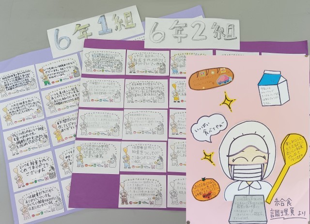 1月26日から30日に、学校給食週間の取り組みをしました。子どもたちは、栄養レンジャーが登場する給食委員会が作成した動画「「給食の歴史」と「給食の食材はどこから?」」を見て、給食について学習したり、給食調理員さんにメッセージカードを書いて感謝の気持ちを伝えたりしました。給食調理員さんからはお礼のメッセージが届きました。