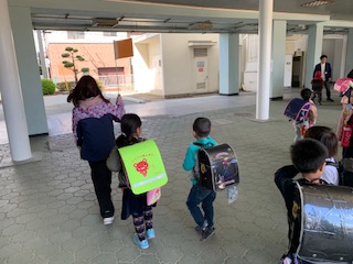 1年生の下校は、4月23日まで集団下校となっています。先生と一緒に下校することで、正しい通学路を覚えて、安全に登下校ができるよう指導しています。